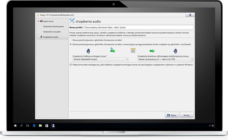 - Tłumaczy mowę na tekst, który następnie można zapisać w pliku i wykorzystać jako napisy w różnych formatach cyfrowych, np. filmach.